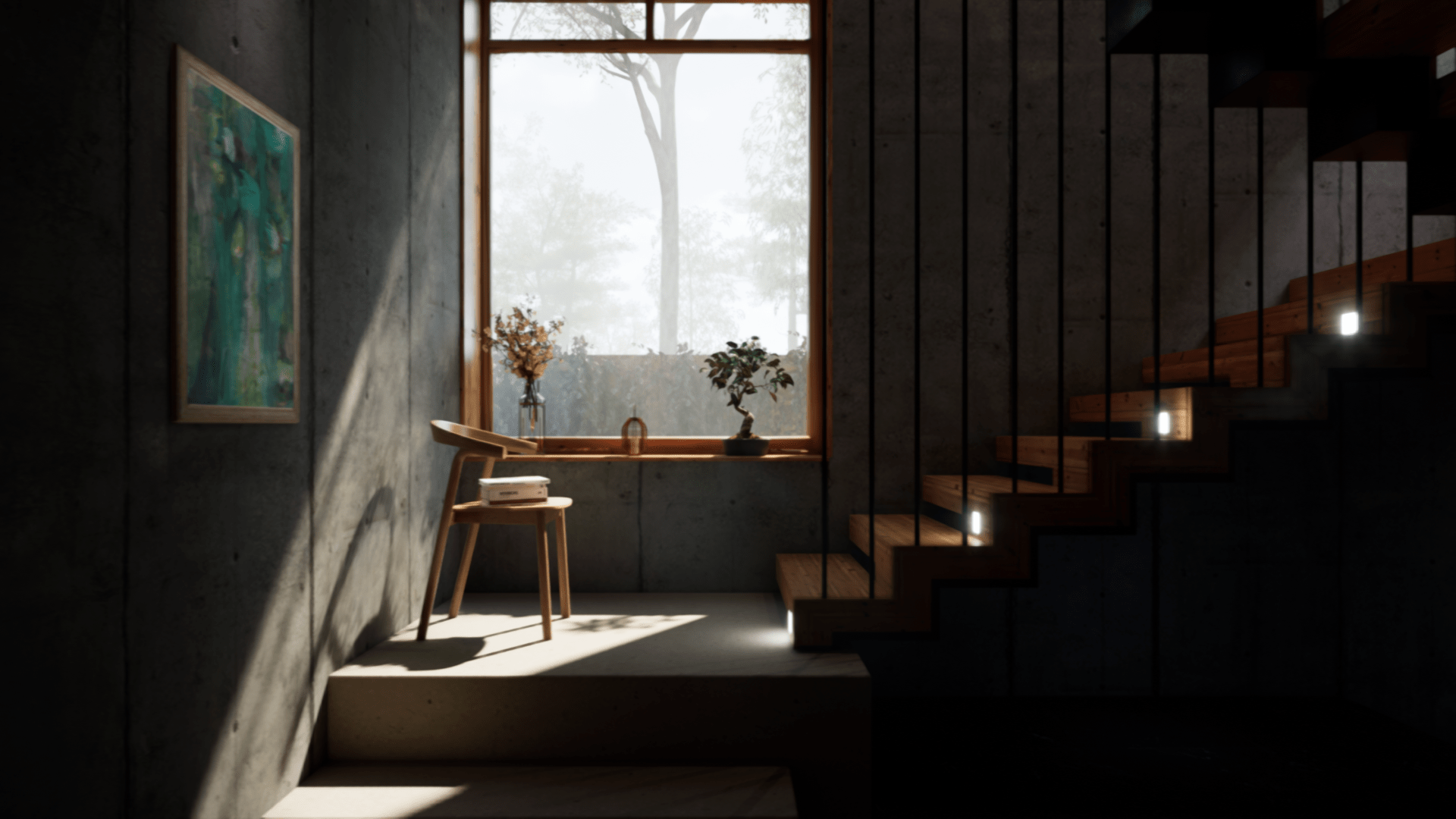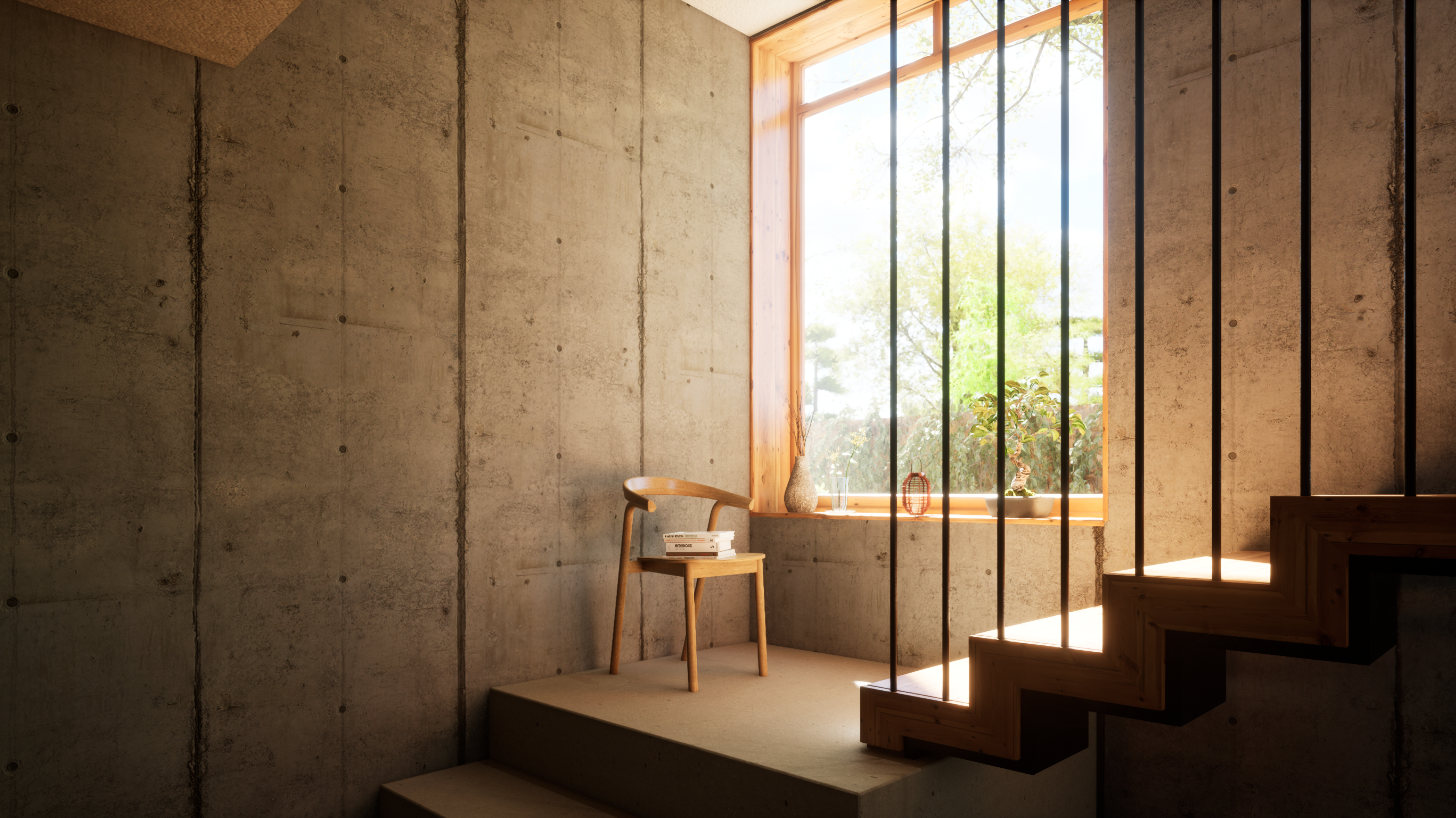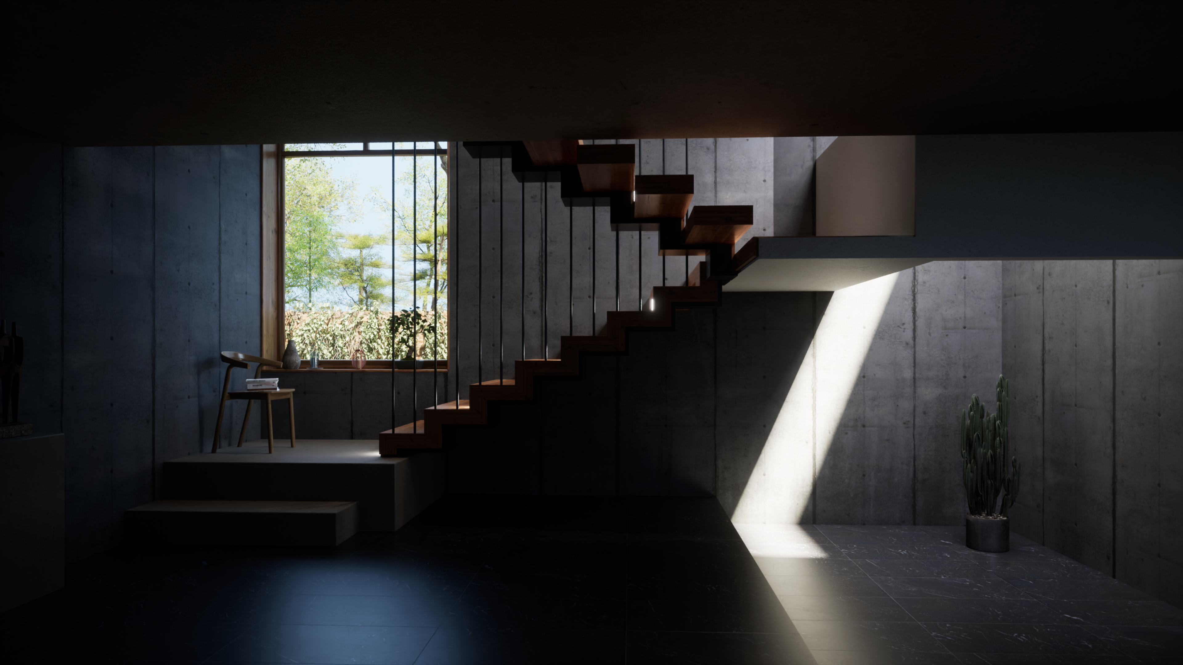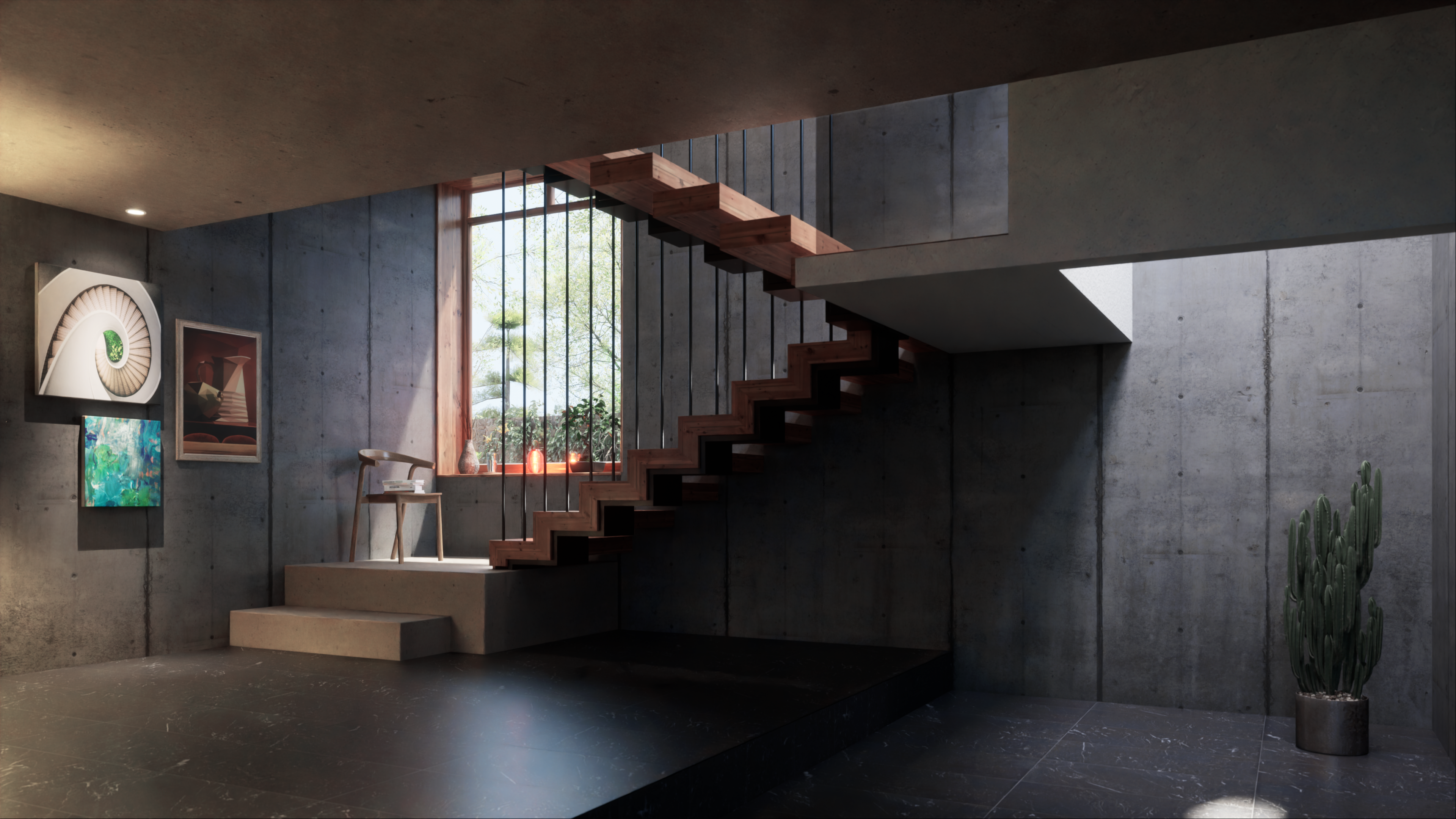 Es un proyecto donde, alrededor de unas escaleras, pruebo algunas variables de la iluminación natural, efectos atmosféricos y de render.