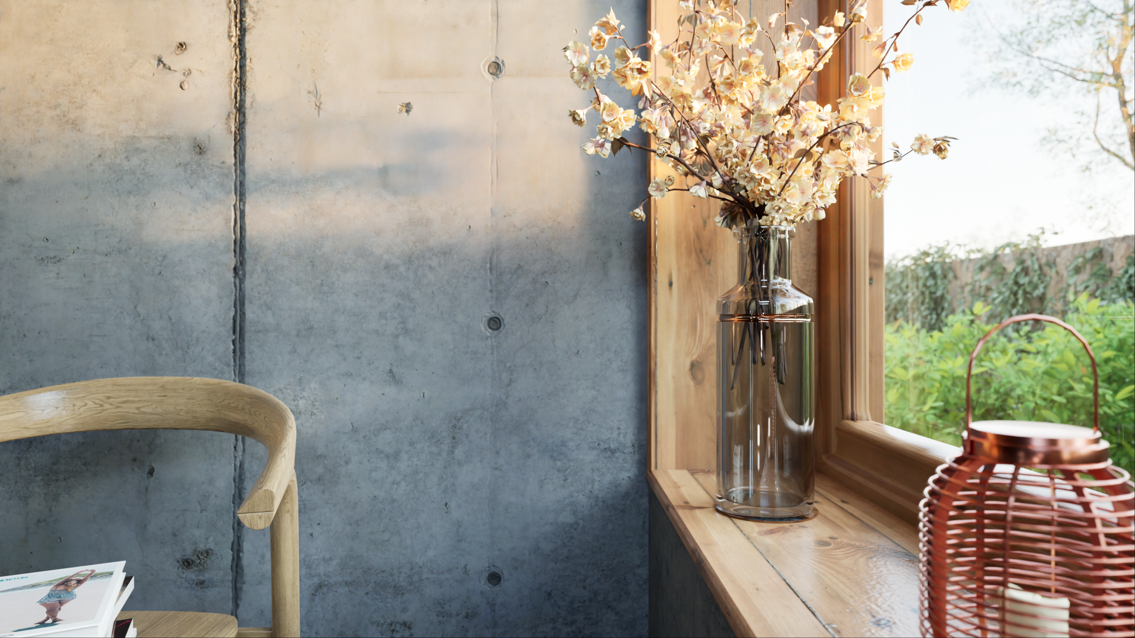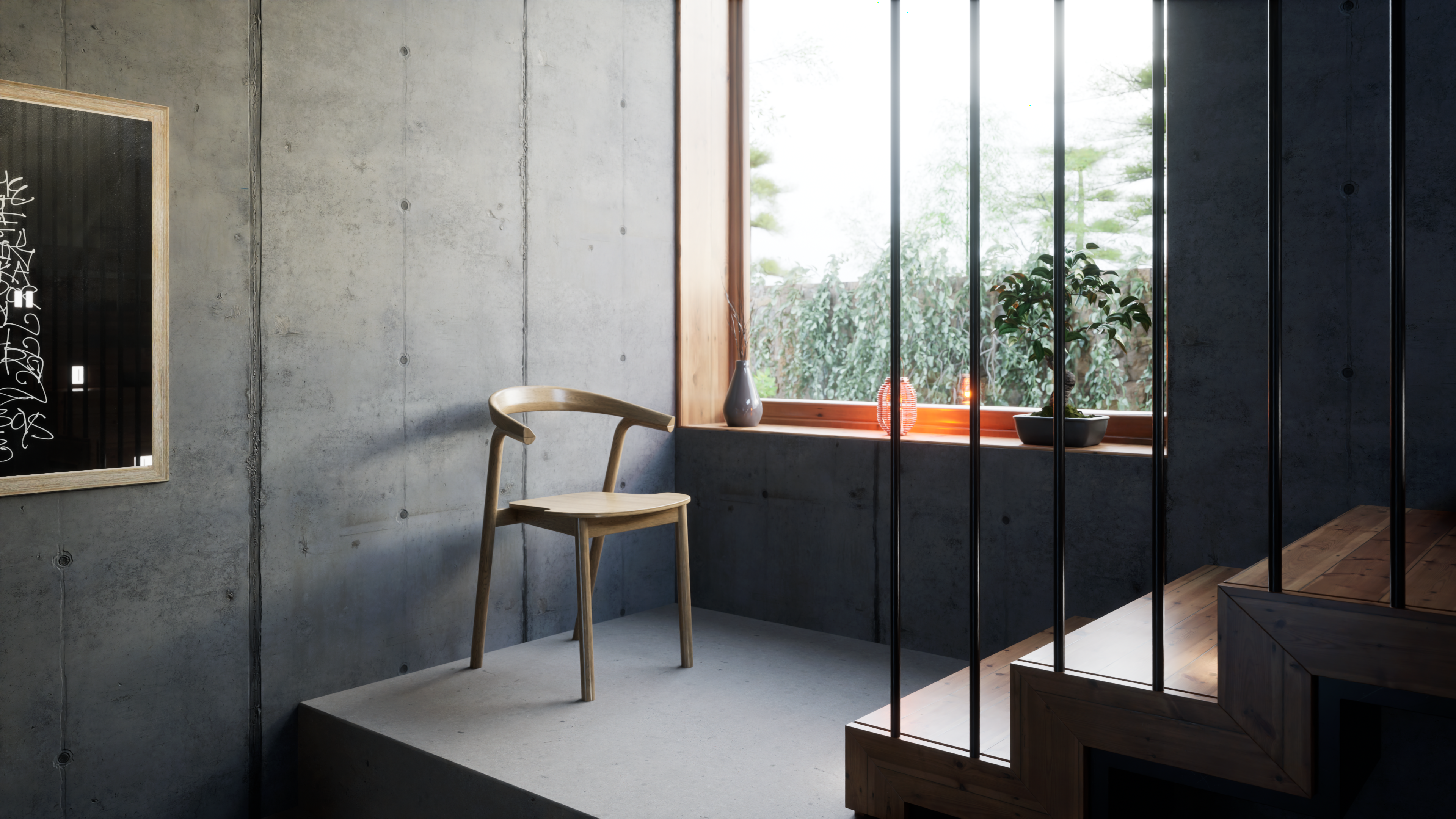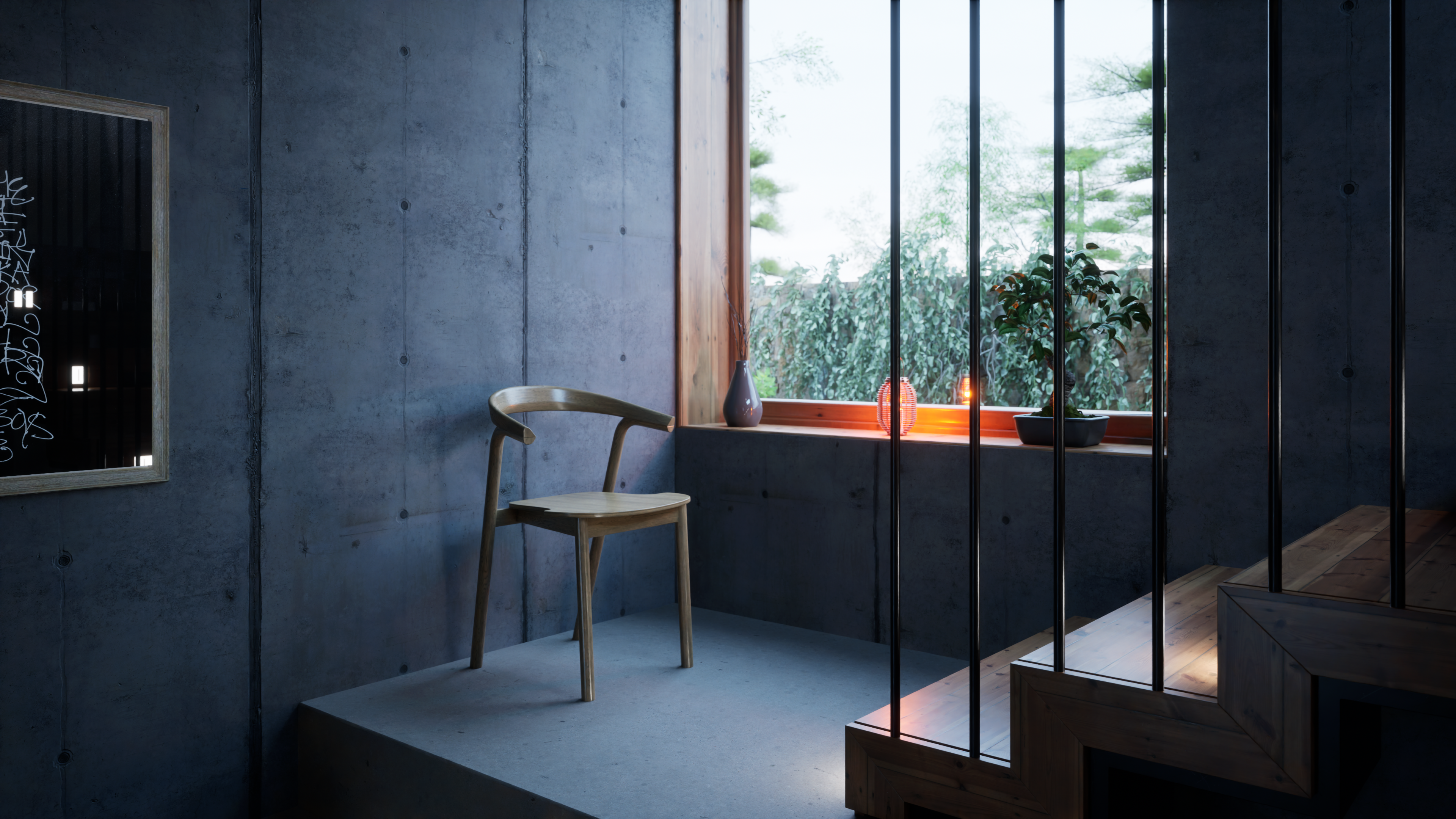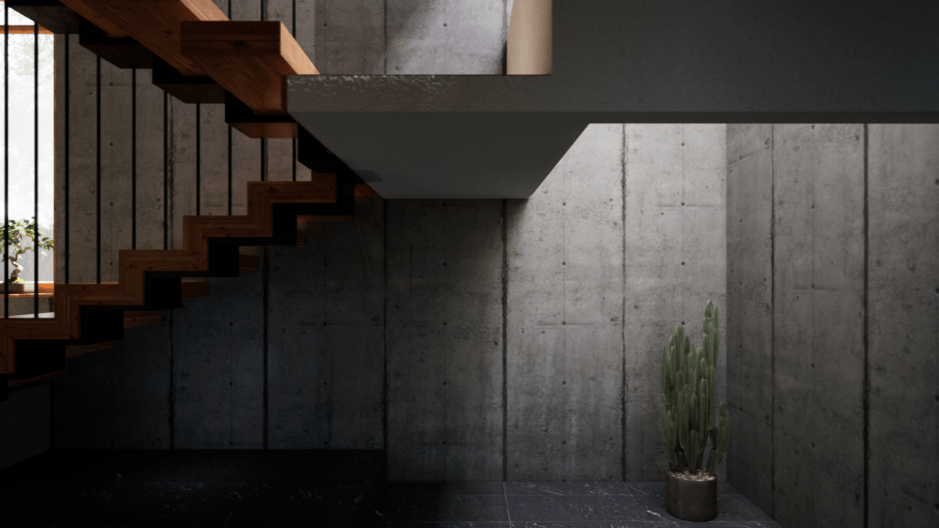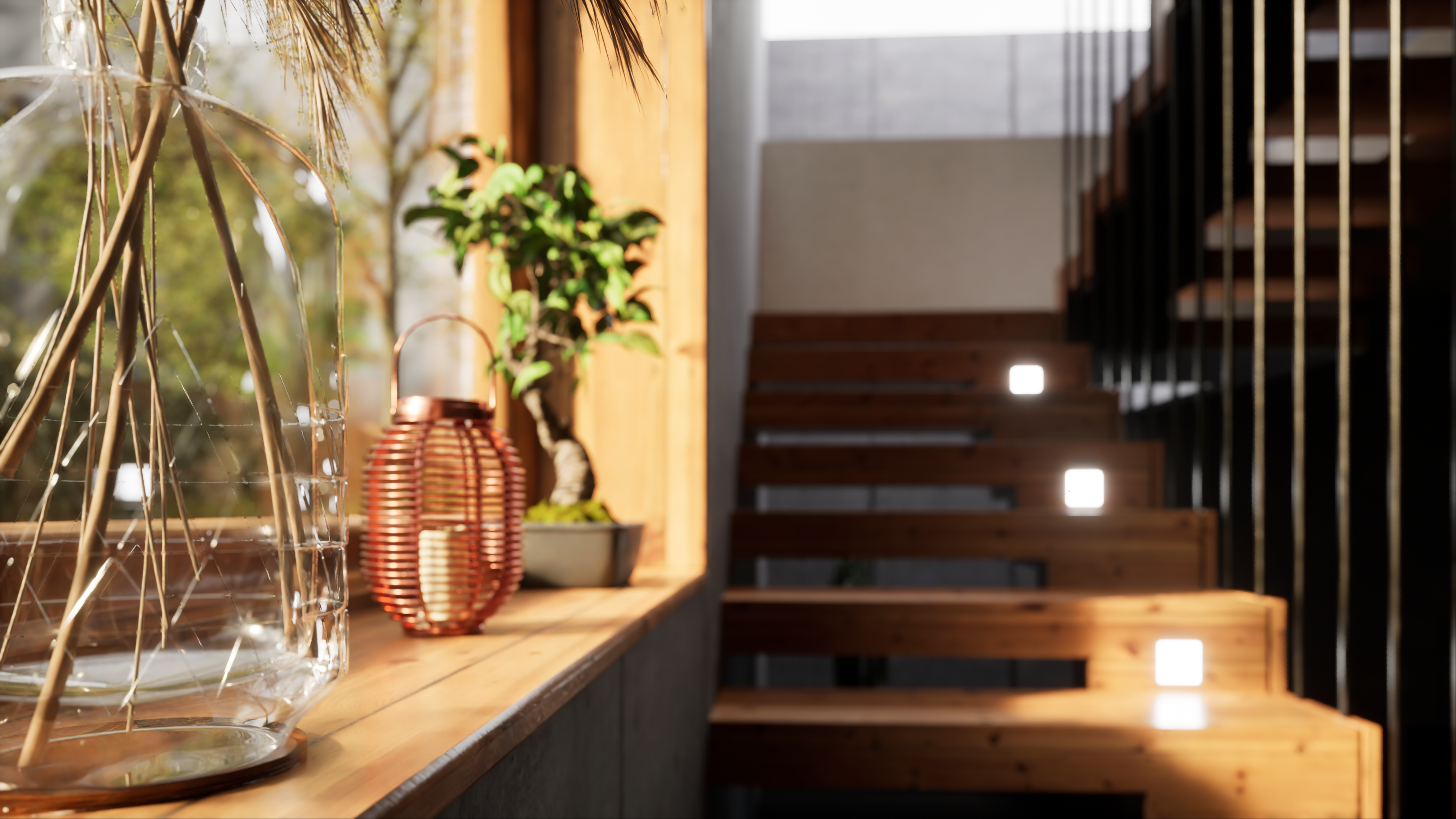 Es un proyecto donde, alrededor de unas escaleras, pruebo algunas variables de la iluminación natural, efectos atmosféricos y de render.